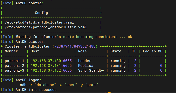出现AntDB init succeeds,集中式高可用版部署完成。