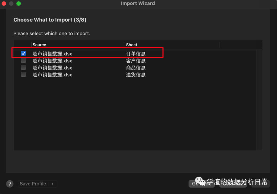勾选需要导入的sheet,本文以订单信息为例子,下一步;