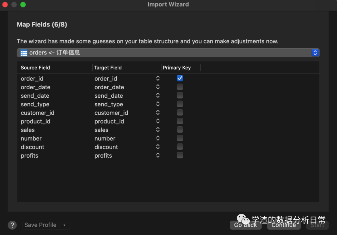 接下来会显示数据源表以及目标表的字段名称,可以核对字段是否一致,order_id为主键: