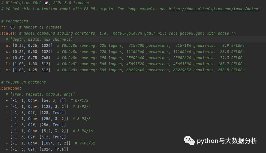 我们看一下yolov8.yaml文件,里面包含了标签总数,yolo几种不同训练模型的Layer数量、参数量、梯度量;骨干网的结构、Head的结构。