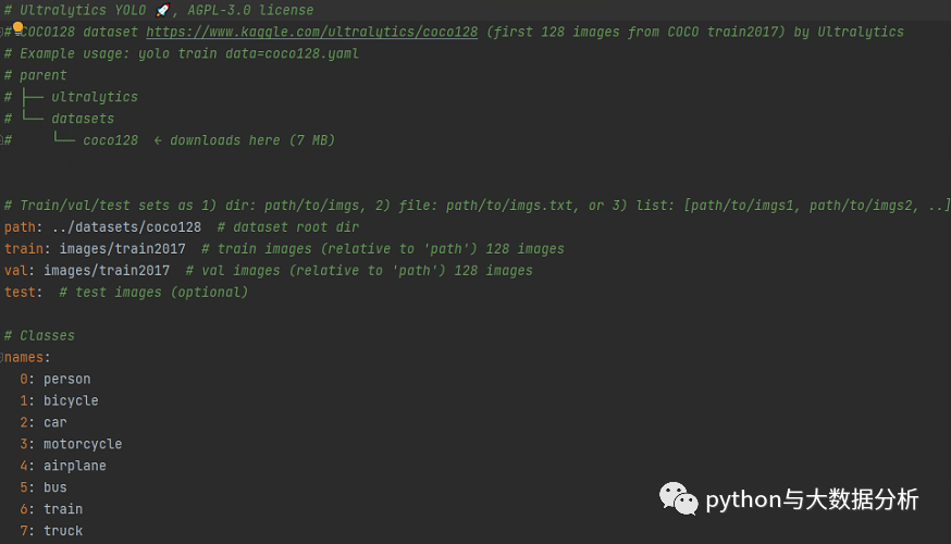 我们看一下coco128.yaml文件,里面包含path(数据集根目录)、train(训练集图片路径))、val(验证集图片路径)、test(测试集图片路径);标签列表清单,按照序号:标签名的方式进行枚举,最后还包括了一个Download script/URL (optional)信息,即下载脚本和路径,这个是可选项 。