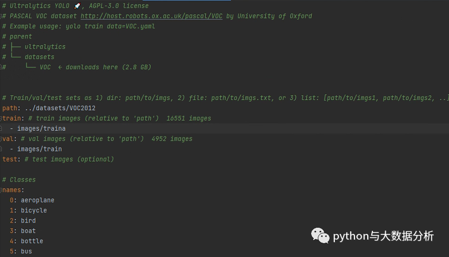 要做的事情很简单,基于coco128.yaml另外复制一份基于训练集命名VOC2012.yaml(我这里是VOC2012)的文件,只需要修改path、train、val、test路径即可;同时需要修改names下的标签列表,然后把多余的download脚本剔除掉,因为假设我们已经提前下载并标注了图片。