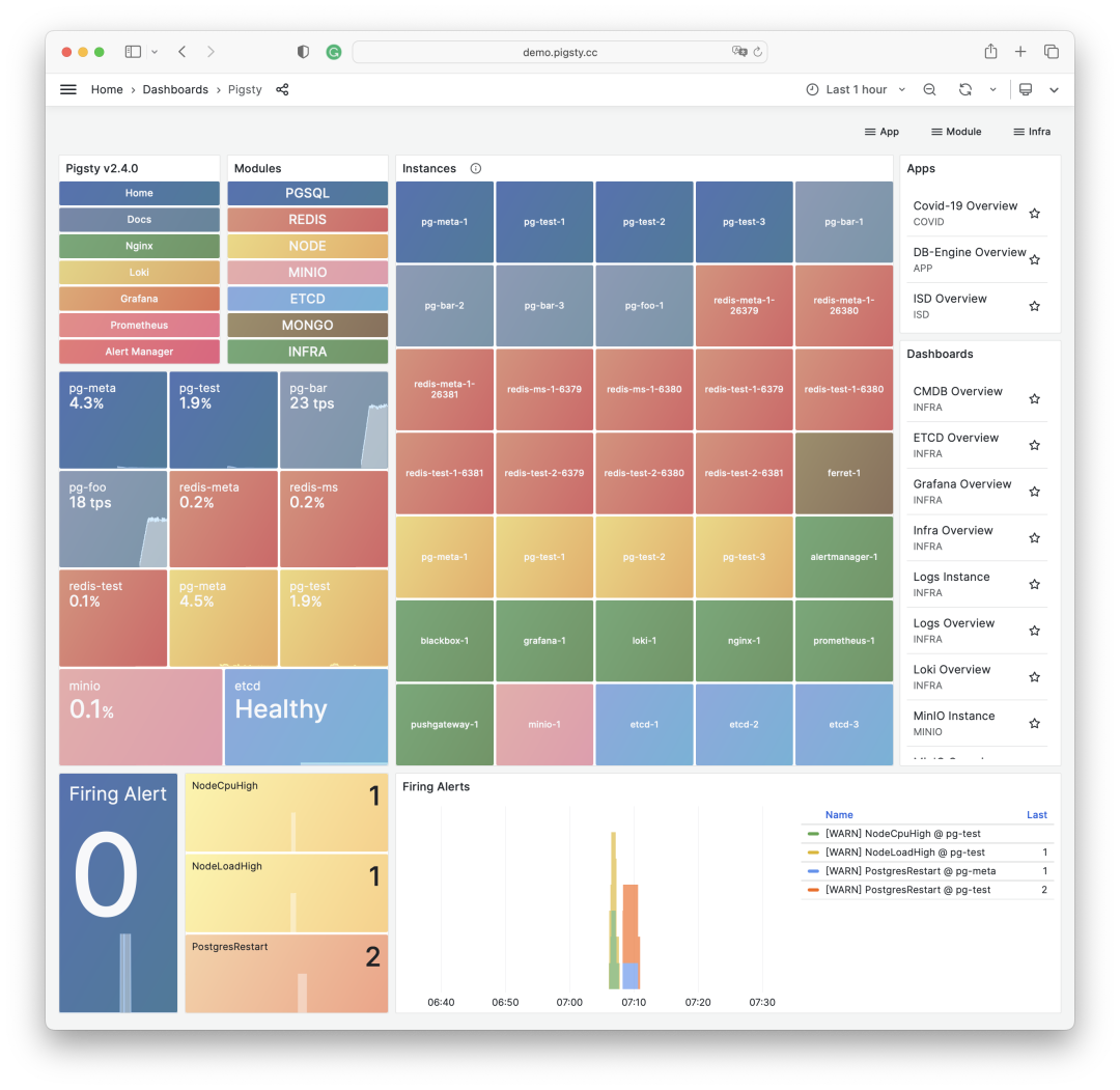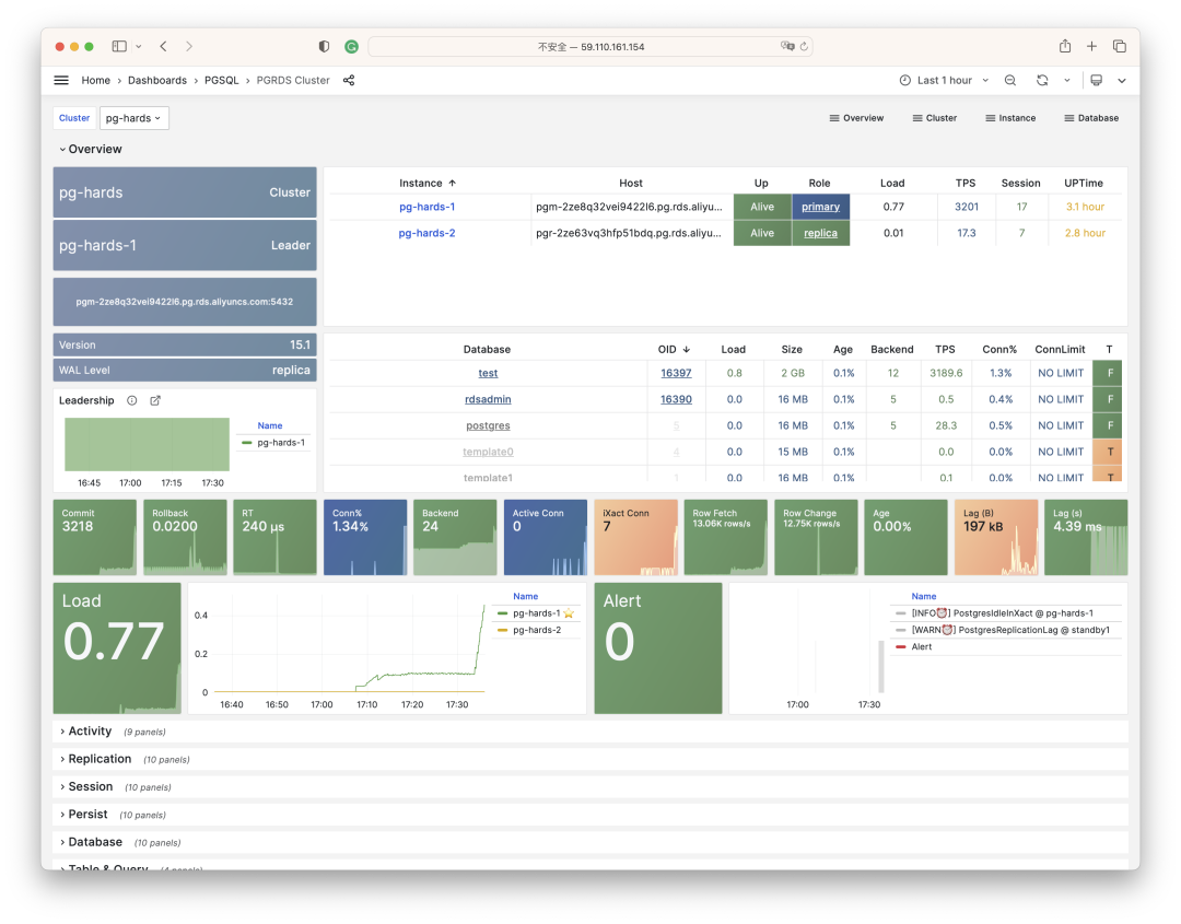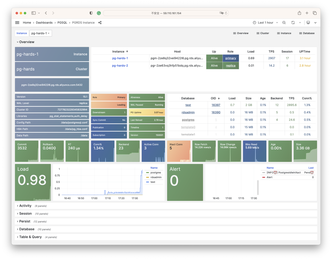 Pigsty v2.4 提供了对 RDS 监控的支持。特别是还添加了对 PolarDB 云数据库的监控支持。当您只有一个远程 PostgreSQL 连接串时,可以使用这种方式将其纳入 Pigsty 监控中。Pigsty 提供了两个全新 Dashboard:PGRDS Cluster 与 PGINS Cluster,用于呈现 RDS PG 的完整指标。