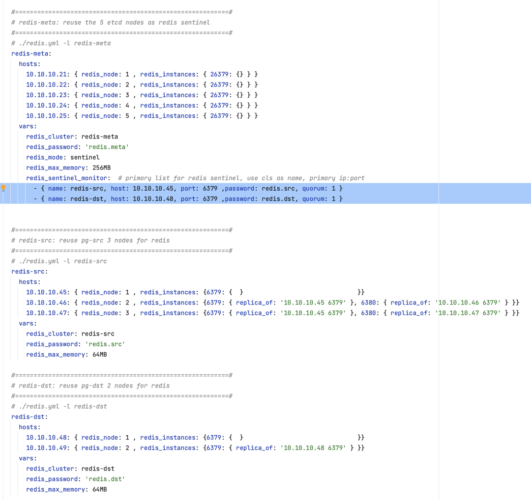 Pigsty v2.4 中,我们提供了一个新的参数 redis_sentinel_monitor ,用于自动配置经典主从 Redis 集群的高可用。该参数只能在 Sentinel 集群上定义,定义中的主库将会自动被哨兵集群所纳管