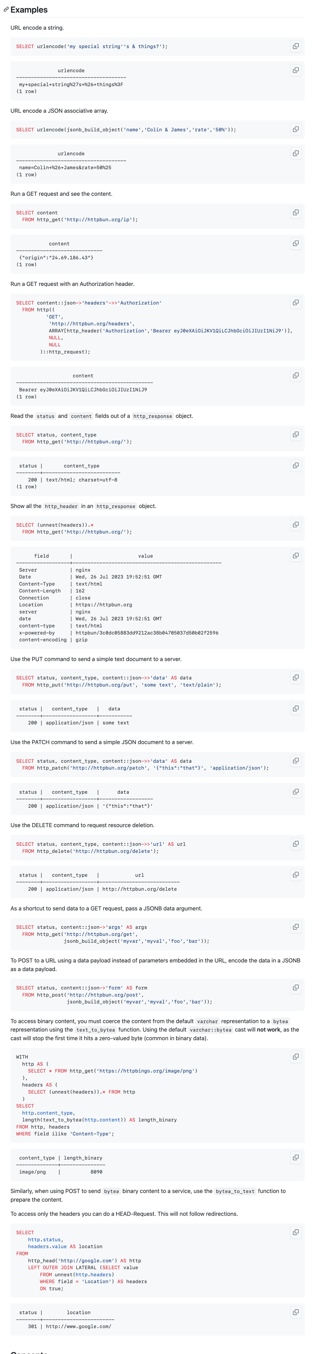 更有甚者,你还可以使用 pgsql-http 插件,使用 SQL 接口来发送 HTTP 请求,处理 HTTP 响应。这让数据库可以与外部系统深度集成与交互,打开无尽的想象空间: