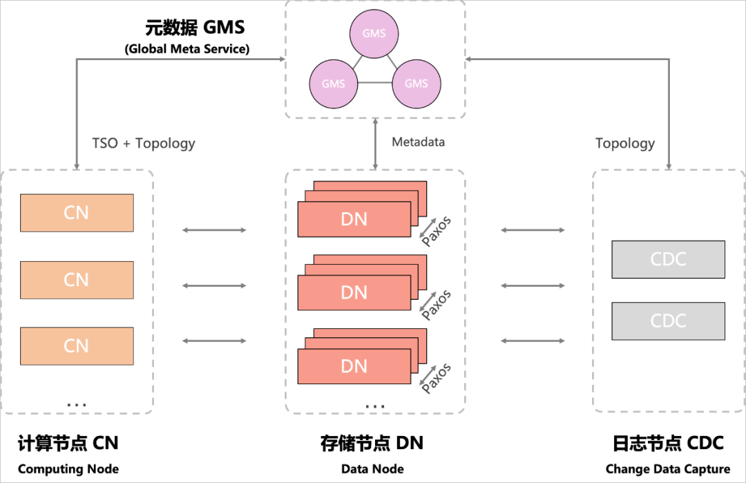 PolarDB分布式版采用了 Timestamp Oracle (TSO) 架构实现全局授时服务,由集群 GMS 提供,CN (Computing Node) 节点作为入口,除了提供基础的数据分片和路由功能,并实现了强大的执行引擎能力,DN (Data Node),提供了基础的数据存储服务,并提供分布式事务和高可用能力,CDC (Change Data Capture),作为数据流通道,提供了数据生态能力,PolarDB分布式版总体架构如图所示: