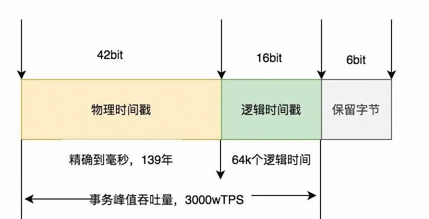 Sequence 实现的时间型生成器,也就是 lease type 等于 Time, 定制 TSO 的格式,使用 42 个 bit 表达毫秒级的物理时间,16 个 bit 表达一个递增的自然数,理论设计上秒级可以实现最大 3000w 的 TPS 吞吐能力,足够支撑一个超大规模的分布式数据库。