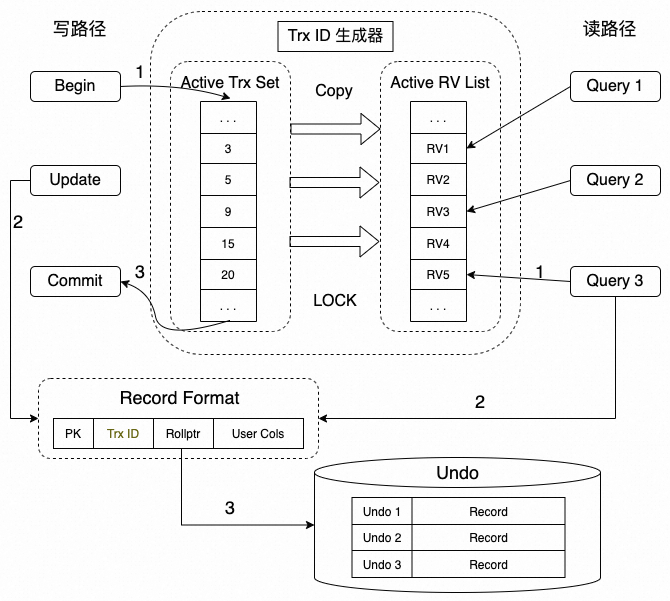 2. 事务过程中,修改操作会将事务ID更新到行记录上来,表示该行记录的最新修改者;
