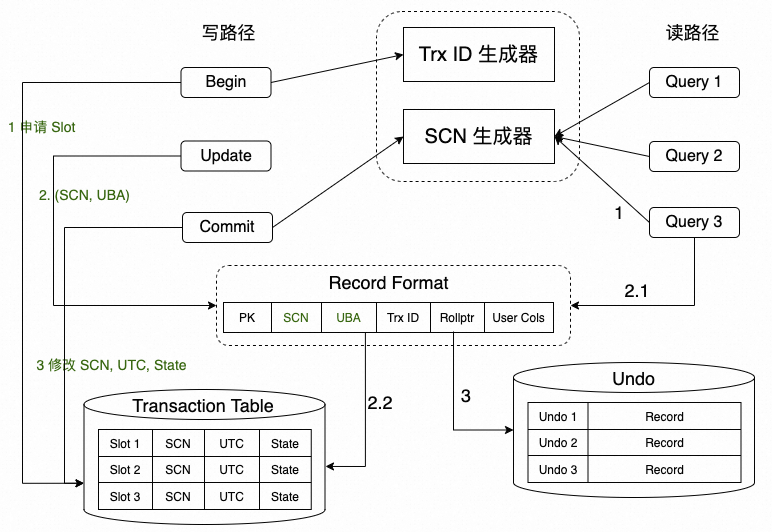 2. 查询进行时,根据行记录的 UBA 地址找到对应的事务槽,获知事务的状态以及提交号;