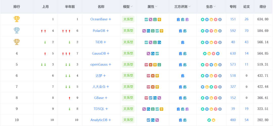 OceanBase 仍以王者之势雄踞墨天轮榜首,本月得分634.8分,新增4篇论文。 其作为一款金融级分布式数据库,全国已有1/4的头部金融客户将其作为核心系统升级首选。上月,OceanBase 中标中原银行2023年信息技术应用创新项目,并开源生态工具 ODC,极大地稳固了其在榜单上的优势地位。