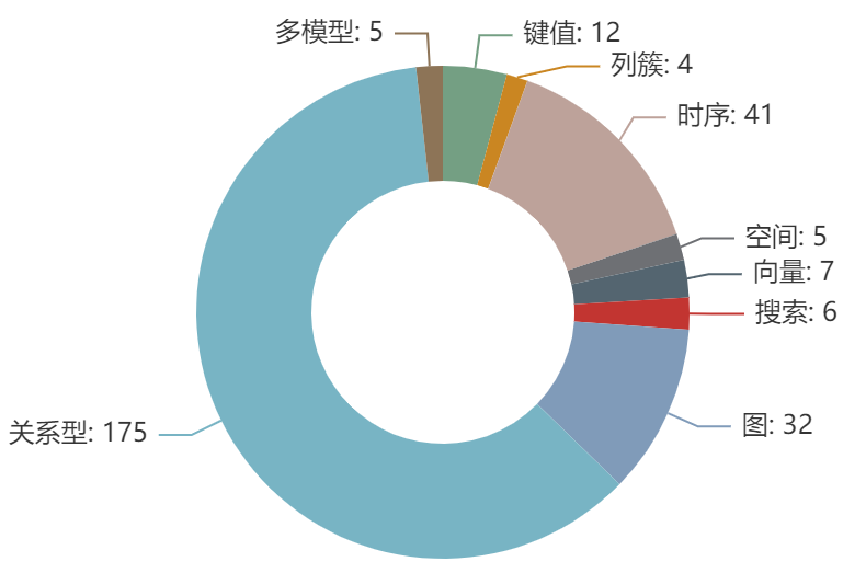 本月排行榜共有287个数据库参与排名,参与排名的数据库中,关系型数据库共有175个,占比60.9%,其次则是图数据库占比11.1%。各模型具体数量如下图所示: