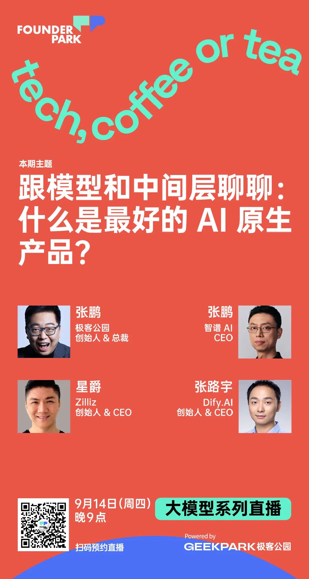 9 月 14 日,本周四晚 21:00,Founder Park 直播间,极客公园创始人&总裁张鹏,将与Zilliz 创始人 & CEO 星爵、智谱 AI CEO 张鹏以及 Dify.AI 创始人 & CEO 张路宇,一起聊聊国内大模型落地的现状和 AI-Native 产品的未来。