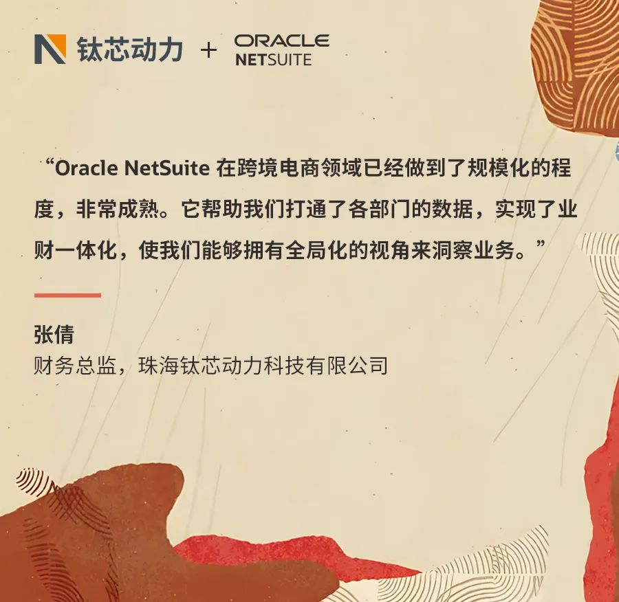 得益于 Oracle NetSuite 在跨境电商领域的成熟度以及友商的良好口碑,钛芯动力仅用一两个月便完成了从选型到签订合同的整个过程。钛芯动力财务总监张倩谈道:“我们看到很多同行业跨境电商上市公司都在使用 Oracle NetSuite,而且 Oracle NetSuite 的数字化程度、业财融合和普适性方面会更符合我们现行发展的需要。”