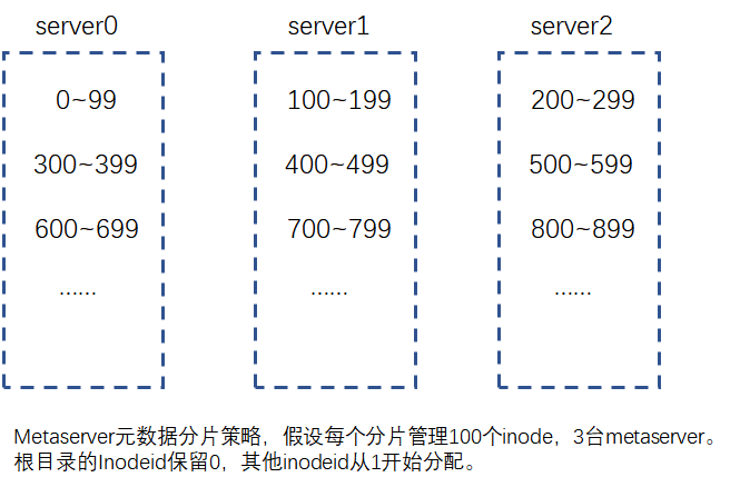 例如,如果按照每个分片管理 100个 inodeid,有 3 个 metaserver,那么分片信息将如下。如果元数据数量增加,可以通过增加元数据集群的服务器来实现线性扩展的目标。
