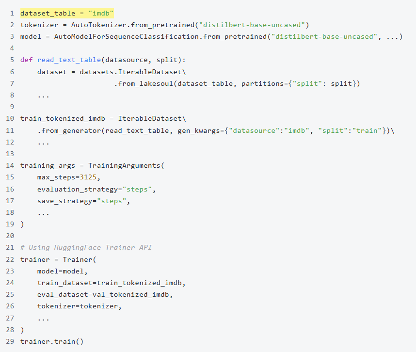 相比于原始的 HuggingFace 提供的 IMDB 的例子:https://huggingface.co/docs/transformers/tasks/sequence_classification,我们只需要在代码中通过 Iteratable Dataset 获取存储在 LakeSoul 上的数据源,并在 TrainingArguments 上做一些调整,其余大部分代码基本保持不变: