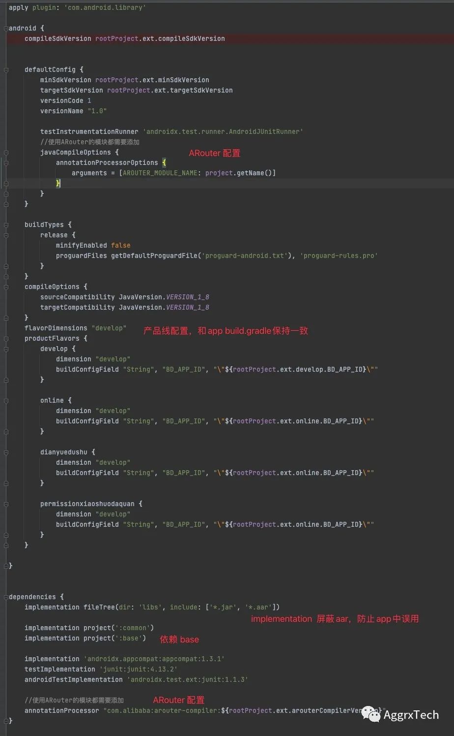 module的build.gradle中,使用implementation方式依赖aar,保证app中不会引用到aar中的代码;ARouter相关配置;依赖 base module