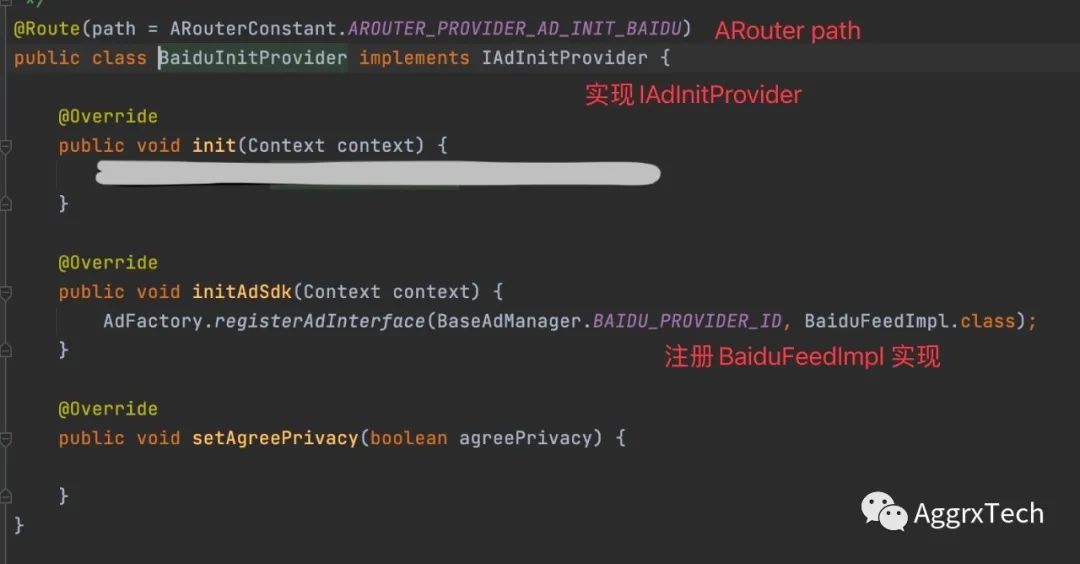实现IAdInitProvider接口,在ARouterConstant中定义ARouter的path,path的规范是/moduleName/(provider/activity/service)/业务/功能,例如/baiduAd/provider/ad/init