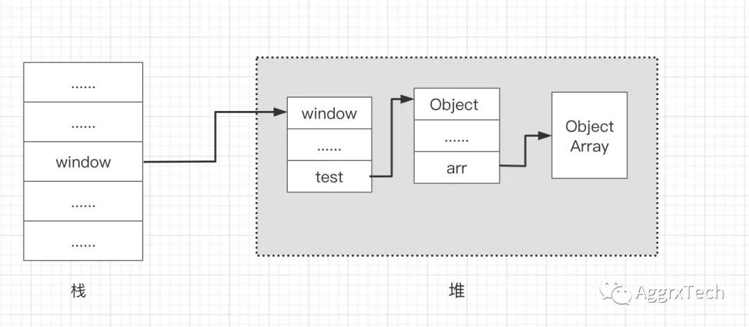 在上列代码中先为 window 对象添加了test属性,并在堆中创建了一个空对象,让window.test指向了该空对象的堆中地址,然后创建了一个长度100的数组,并将 test.arr指向了该数组。