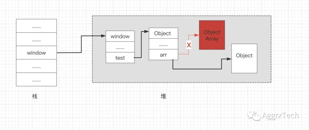 从上图可以看到栈堆的指向, 如果此时重新给 window.test.arr 赋值,把数组改成一个对象: