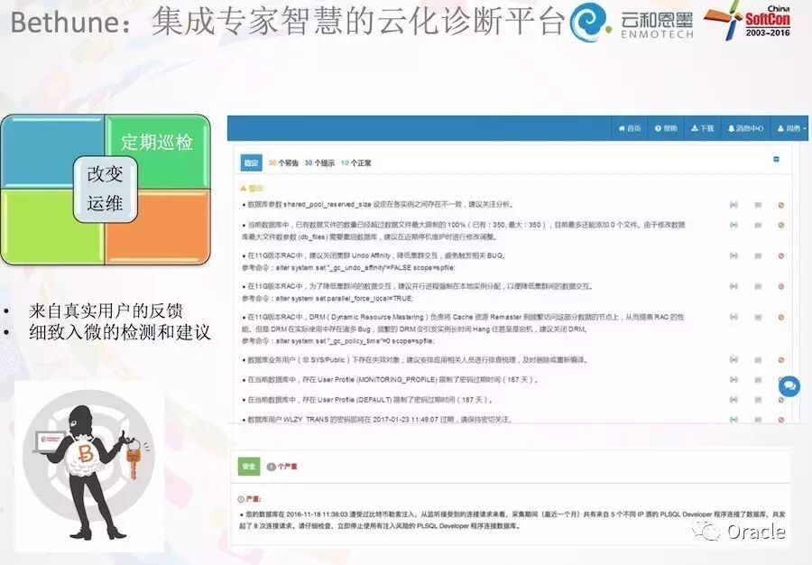 在大会的最后,我还向大家分享了我们的一点小情怀,Bethune - 白求恩 这个词引起了大家广泛的兴趣,云和恩墨以白求恩为名创造了一款智能的数据库巡检平台,以SaaS模式为用户提供数据库体检服务,更重要的是这个平台是完全免费的。