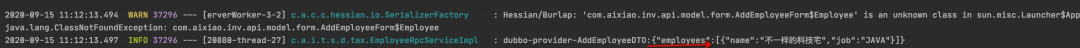 呢?我们回过头看看之前打印参数的日志,有一个警告日志提示了java.lang.ClassNotFoundException:com.aixiao.inv.api.model.form.AddEmployeeForm$Employee
