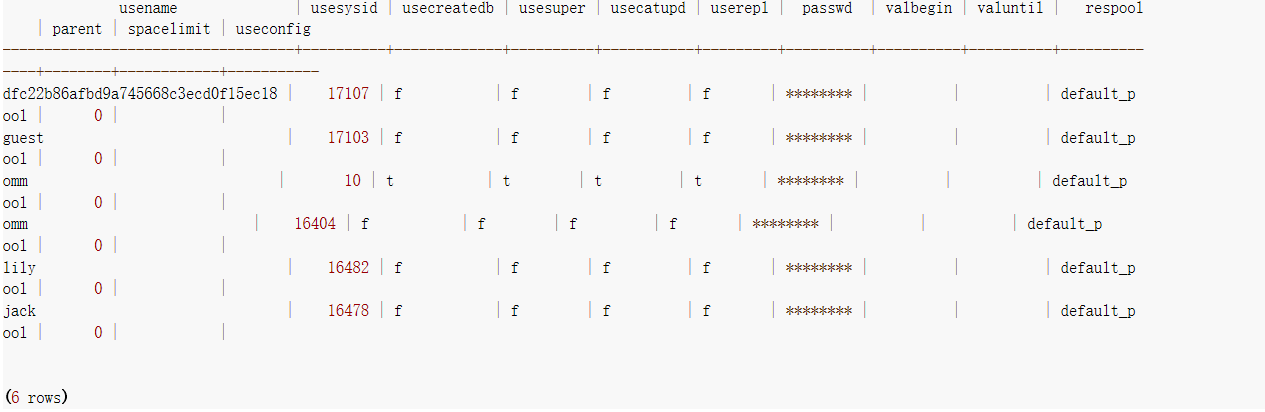 通过PG_USER可以查看数据库中所有用户的列表,还可以查看用户ID(USESYSID)和用户权限。