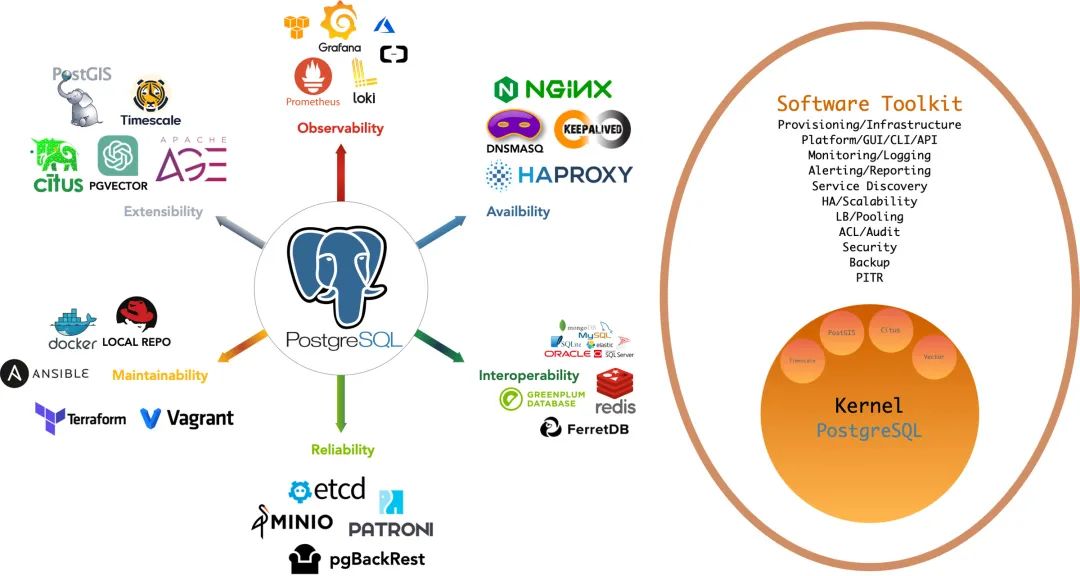 •开箱即用的RDS:从内核到RDS发行版,在 EL7-9 下提供 12-16 版本的生产级 PostgreSQL 数据库服务。•丰富的扩展插件:深度整合 140+ 核心扩展,提供开箱即用的分布式的时序地理空间图文向量数据库能力。•灵活的模块架构灵活组合,自由扩展:Redis/Etcd/MinIO/Mongo;可独立使用,监控现有RDS/主机/数据库。•惊艳的观测能力:基于现代可观测性技术栈 Prometheus/Grafana,提供令人惊艳,无可比拟的数据库观测能力。•验证过的可靠性:故障自愈的高可用架构:硬件故障自动切换,流量无缝衔接。并提供自动配置的 PITR 兜底删库!•简单易用可维护:声明式API,GitOps就位,傻瓜式操作,Database/Infra-as-Code 以及管理SOP封装管理复杂度!•扎实的安全实践:加密备份一应俱全,自带基础ACL最佳实践。只要硬件与密钥安全,您无需操心数据库的安全性!•广泛的应用场景:低代码数据应用开发,或使用预置的 Docker Compose 模板,一键拉起使用PostgreSQL的海量软件!•开源的自由软件:以云数据库1/10不到的成本拥有与更好的数据库服务!帮您真正“拥有”自己的数据,实现自主可控!