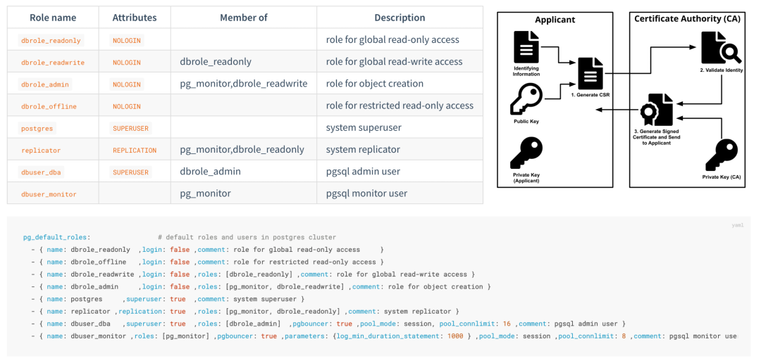 Pigsty 针对 PostgreSQL 提供了一套开箱即用,简单易用,精炼灵活的,便于扩展的访问控制体系[38],包括职能分离的四类默认角色:读(DQL) 写(DML) 管理(DDL) 离线(ETL) ,与四个默认用户:dbsu replicator monitor admin。所有数据库模板都针对这些角色与用户配置有合理的默认权限,而任何新建的数据库对象也会自动遵循这套权限体系,而客户端的访问则受到一套基于最小权限原则的设计的 HBA[39] 规则组限制,任何敏感操作都会记入日志审计。