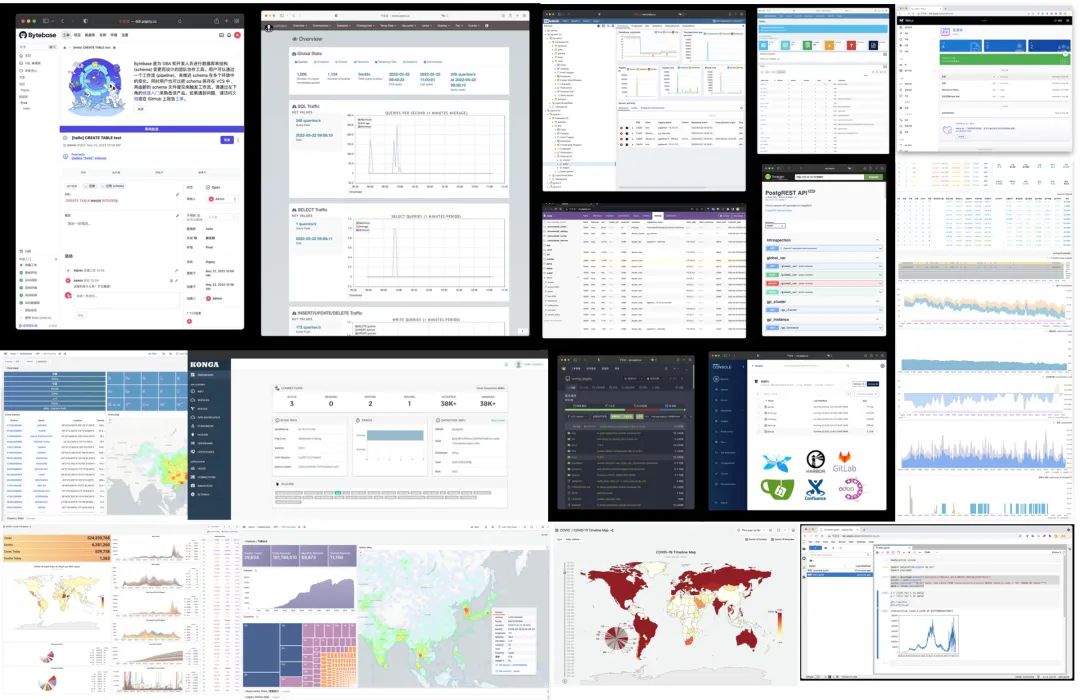Pigsty 也提供了与 PostgreSQL 紧密联系的应用开发工具集:PGAdmin4、PGWeb、ByteBase、PostgREST、Kong、以及 EdgeDB、FerretDB、Supabase 这些使用 PostgreSQL 作为存储的"上层数据库"。更奇妙的是,您完全可以基于 Pigsty 内置了的 Grafana 与 Postgres ,以低代码的方式快速搭建起一个交互式的数据应用来,甚至还可以使用 Pigsty 内置的 ECharts 面板创造更有表现力的交互可视化作品。