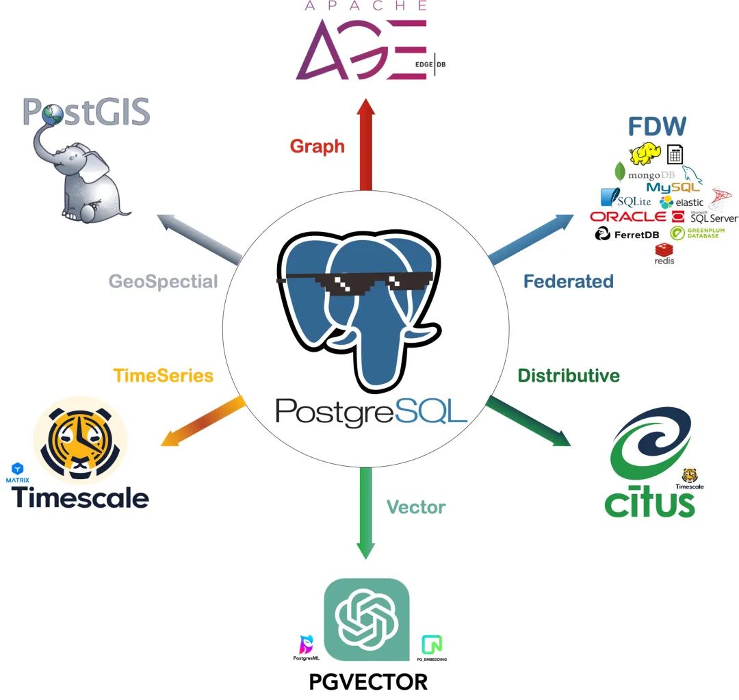PostgreSQL 的灵魂在于其丰富的扩展插件生态,而 Pigsty 深度整合了 PostgreSQL 生态扩展插件,为您提供开箱即用的分布式的时序地理空间图文向量数据库能力!