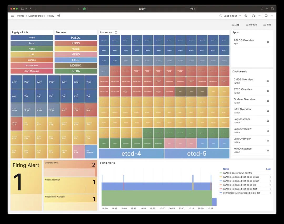 Pigsty 所管理的任何组件都会被自动纳入监控之中,包括主机节点,负载均衡 HAProxy,数据库 Postgres,连接池 Pgbouncer,元数据库 ETCD,KV缓存 Redis,对象存储 MinIO,……,以及整套监控基础设施本身。大量的 Grafana 监控面板与预置告警规则会让你的系统观测能力有质的提升,当然,这套系统也可以被复用于您的应用监控基础设施,或者监控已有的数据库实例或 RDS。