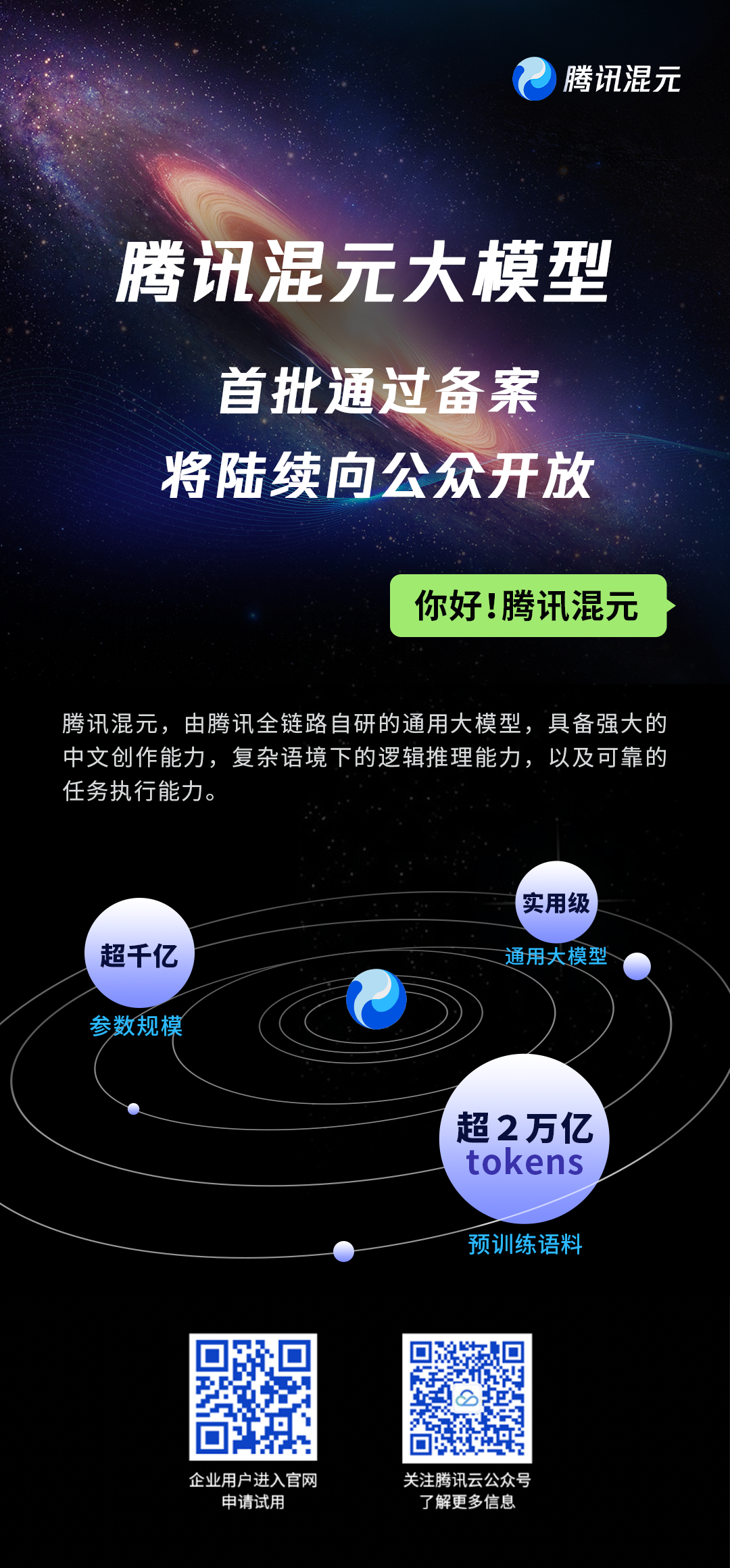 今天,腾讯混元大模型首批通过备案,将正式上线,并陆续面向公众开放。