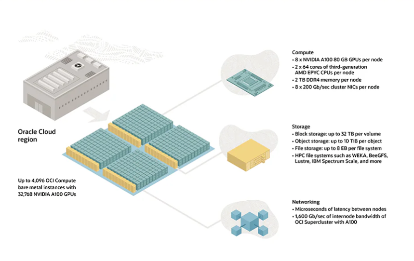 OCI Supercluster包含了OCI Compute Bare Metal、基于NVIDIA网络的超低延迟 RoCE 集群,以及 HPC 存储的选件,是训练生成式AI的理想选择,包括对话应用程序和扩散模型。OCI计算裸机实例和虚拟机支持多达数万个NVIDIA GPU,可以为计算机视觉、自然语言处理、推荐系统等应用程序提供支持。