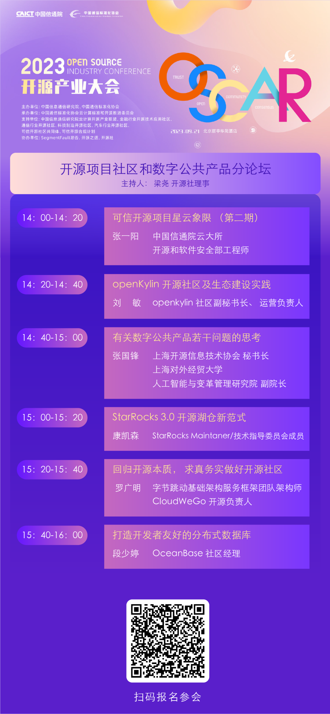 中国信息通信研究院(简称“中国信通院”)将在 2023 年 9 月 21 日举办“2023 OSCAR 开源产业大会”,本次大会将关注开源治理、安全合规、技术创新等领域,邀请上百位专家大咖共话开源,推动开源技术与产业协同共进。