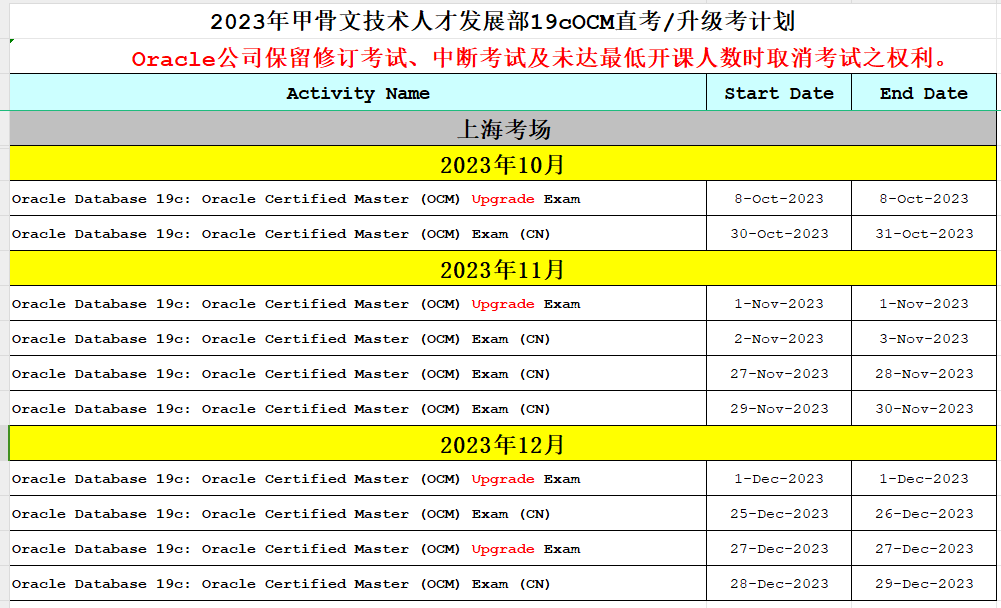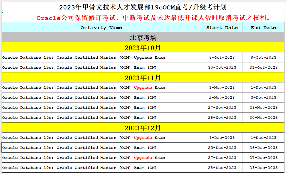 Oracle Database 19c: Oracle Certified Master (OCM) Exam (CN) | 30-Oct-2023 | 31-Oct-2023 |