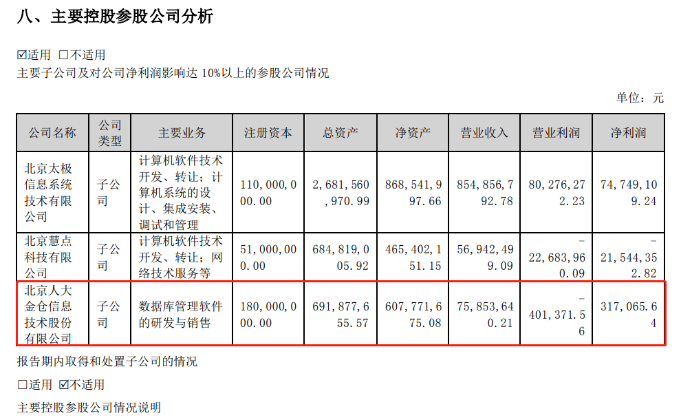 2023年8月31日,太极计算机股份有限公司发布《2023年半年度报告》。报告显示,太极股份子公司北京人大金仓信息技术股份有限公司2023年上半年营业收入7585.36万元,同比2022年上半年下降38.35%, 营业利润为 -40.14 万元,同比由盈转亏下降104.01%,净利润 31.7 万元,同比降低 96.63%。