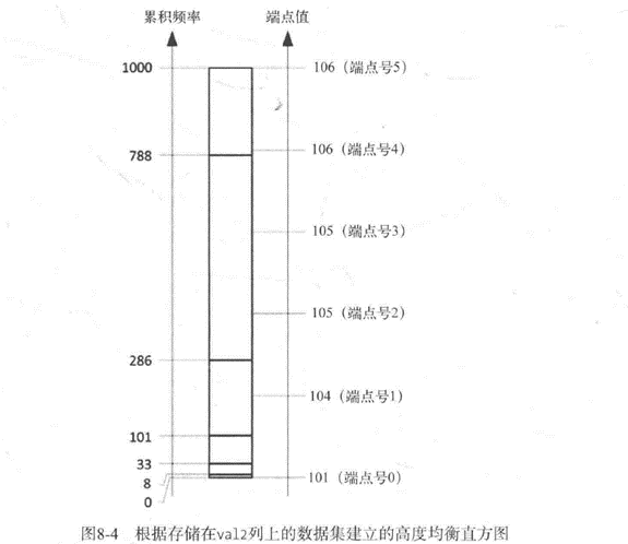 下面的查询是一个如何为val2列生成一个高度均衡直方图的例子。图8-4展示了这个查询返回数据的一个图示。注意每个桶的端点值正是拆分数据出现的点。此外,桶0被添加进来用以存储最小值: