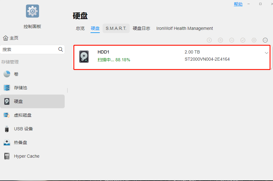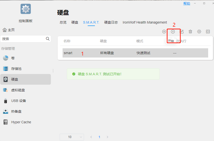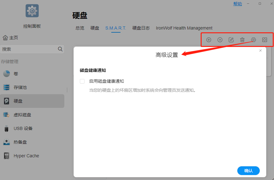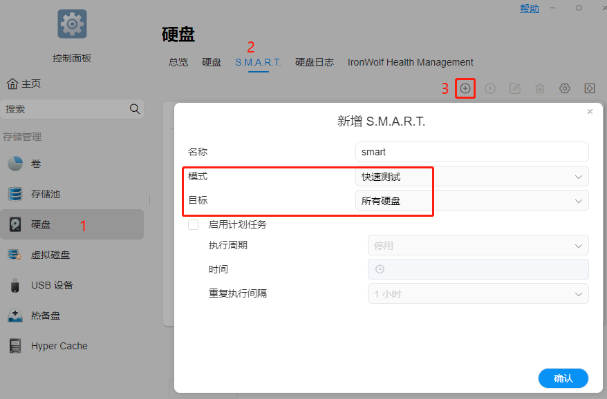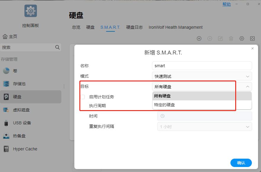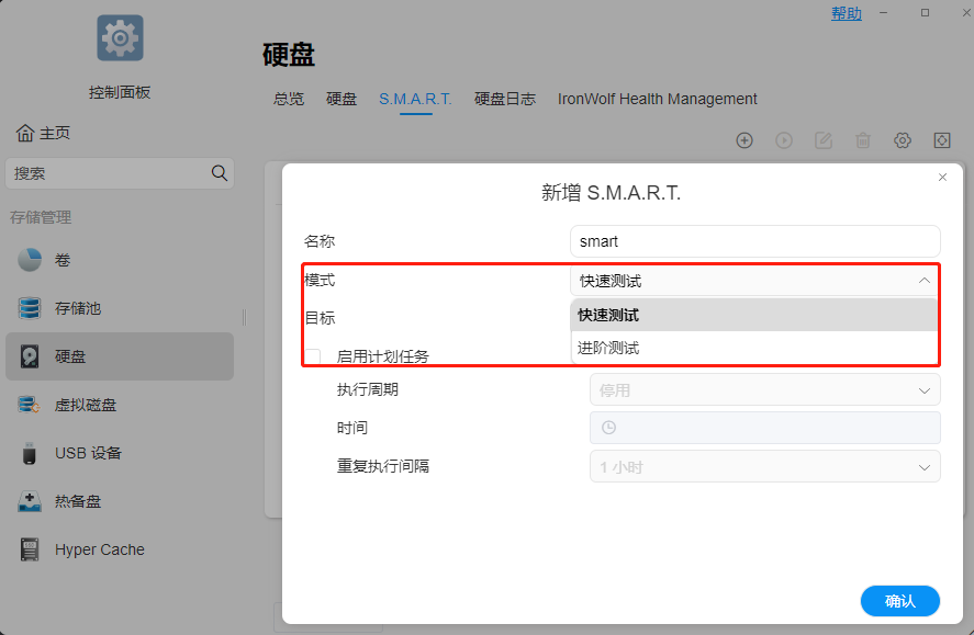 1、登入TOS系统,打开控制面板,选择硬盘,点击S.M.A.R.T,选择右上角的创建;