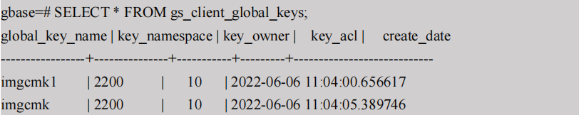gbase=# CREATE CLIENT MASTER KEY ImgCMK WITH (KEY_STORE = localkms,