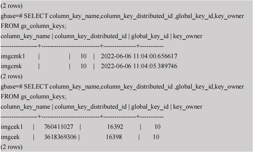 gbase=# CREATE COLUMN ENCRYPTION KEY ImgCEK1 WITH VALUES