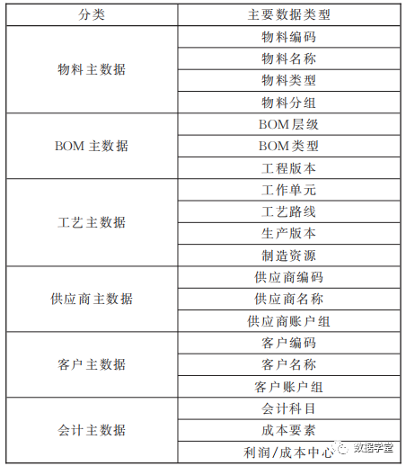 根据主营业务方案设计,为满足不同业务场景的多维度管控,需要进一步细化6大类主数据。(1)物料主数据是在公司的业务活动中被使用、消耗或制造的商品或服务,根据使用场景的不同划分为8类,包括产品相关物料、非产品相关物料、无价值物料、服务性物料、贸易物料、办公用品、设备设施和其他。考虑实际业务管理需求,对前5类物料进行物料编码管理,以达到对物料数量和价值精细化管理的管控目的。后3类物料不进行编码管理,简化对特殊物资的处理流程,快速响应现场业务需求,降低管理成本。(2)BOM主数据包括设计BOM、制造BOM、检修BOM、保养BOM、系统级BOM和销售订单BOM共计6种类型。前5类为物料类BOM,其中,设计BOM精确描述产品零件与零件之间的设计关系。制造BOM用于生产,与设计BOM一脉相承,结合工艺过程对设计BOM进行调适。销售订单BOM为订单类BOM,仅针对特定销售订单及销售订单行项目有效。(3)工艺主数据主要在生产过程中用于指导厂内车间或委外供应商的加工制造,主要包括工程变更、工艺路线、文档、工作中心和生产版本。产品制造工艺主数据中工程变更主数据是包含内容最广且结构最复杂的一类主数据,以其他类型的主数据变更为基础而存在。(4)客户/供应商主数据可分为若干账户组,关系到日常的客户和供应商的应收、应付、采购、销售等相关交易,账户组设置根据客户/供应商的不同实行分组管控。客户主数据主要是客户档案的维护和管理,保证各业务条线具有一致的客户信息,提高对外服务质量。供应商主数据包括采购部门和其他部门的物资采购供应商档案数据。(5)会计主数据涉及到集团和法人公司之间的科目设置,分为财务会计和管理会计2大类。对于属于财务会计的会计科目主数据,按上级组织要求进行统一的会计科目表编制。对于属于管理会计的成本要素、利润中心和成本中心,按照管理会计的要求进行统一的编码规则编制和收集。数据核心方案的制定需要贴合业务需求和管理要求,评估企业的实际业务,识别主数据在业务中的应用情况,考虑主数据的管理颗粒度和使用紧迫性。下面详述物料主数据、BOM主数据和工艺主数据的核心方案。(1)物料主数据是所有其他主数据的基础,包含了研发、工艺、销售、采购、计划、质量、仓储和财务等信息,物料主数据是连接各业务模块的直接桥梁,其核心内容主要有物料类型、物料状态、物料组、基本计量单位、MRP参数等。物料类型用于物料分类,基于公司物料编码管理范围和不同业务层面的管理需求,将物料类型分为产品相关物料、非产品相关物料、无价值物料、服务性物料和贸易物料共计5类,其中产品相关物料的物料编码源于PLM系统,其余物料编码均源自ERP系统。物料状态用于确定在不同的业务(例如采购)中处理物料的方式,通过定义物料的不同状态,控制物料的使用范围和业务场景,物料状态种类包括工厂级别物料状态和分销链级别物料状态。工厂级别物料状态主要控制计划、生产、采购和库房等工厂级别的业务,分销链级别物料状态主要控制销售相关业务。物料组是根据物料管理范围和方案为方便业务部门的分类使用和统计,将物料组分为产品相关类、非产品相关类和无编码管理类3大类,其中产品相关类物料按照采购、库房、质量和工艺共同确定的规则划分,非产品相关类的物料组由各归口管理部门根据管理需要编订,无编码管理类则根据项目总体的方案要求设置。基本计量单位是一个严谨的物料属性,物料发生业务后便无法更改,因为成本的核算和各业务部门的后续使用,全部基于该属性。为此,基本计量单位使用清单需要研发部门和业务部门有高度的认知统一。MRP参数是用于计算所需物料的需求数量和需求时间的关键字段,通过对MRP参数的设定,从而确定对不同需求来源的物料进行合理的计划和排产,并进一步预测半成品和原材料的加工进度和订货日程,MRP参数包括策略组、未清期间和独立集中等。