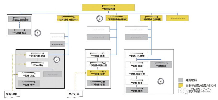 (2)BOM主数据是产品研发的核心,某型制动夹钳BOM示意图如图1所示,BOM不仅是MRP的重要输入数据,同时也是财务部门进行成本核算,制造部门组织生产的重要依据。BOM层级结构是BOM的核心内容,要考虑到计划、生产、采购、库房、质量和财务等业务部门的需求,MBOM的最终层级结构需要在EBOM的基础上增加生产性辅料和生产性包装。标准委外是为了加强和方便对于委外加工过程的精细化管理,为此需在EBOM的基础上,根据工艺过程件的设置原则和BOM层级的展开要求添加工艺过程件。客供料和供应商料是对于多层结构零件中的特殊子件属性的区分。若子件为采购属性时,且为供应商自己采购的料,则该子件在此BOM中为供应商料。若子件是做数量管理的客户提供物料则为客供料,客供料由特殊获取控制从无价值工厂出料。(3)工艺路线主数据是描述加工过程和装配操作顺序的技术文件,是多个工序的序列和集合。工序是生产作业人员或机器设备为了完成指定的任务而做的一个或一连串动作,工艺主数据的核心内容主要有加工工序与工时定额、工序控制码和工序外协数量专项规定。加工工序与工时定额,工艺路线的加工工序分为自制类和外协类,自制类工序的作业标准值有人工工时、机器工时、制造费用和加工周期4种。外协类工序需要采购组织、采购组、外协供应商、加工净价和计划交货时间等信息。工序控制码用于工序过程控制,控制点包括是否必选报工、是否必填工时、是否需要质检、厂内自制还是工序外协和常规工艺路线还是临时工单等内容。工序外协数量规范了工序外协业务涉及到的数量,包括外协工序的净价与执行该工序的外协服务组件数量的关系,工序外协采购申请和采购订单中数量与生产订单检修产品数量的关系,采购订单收货的实物数量与产品和实物配比的关系。数据规范包括物料填写规范、BOM编制规范和工艺路线编制规范。物料填写规范由公司数据组牵头制定,该规范指导了各业务部门数据负责人维护主数据和深刻理解物料主数据中所有使用到的字段,便于业务部门的使用。BOM编制规范和工艺路线编制规范由工艺部门牵头制定,BOM编制规范规定了制造BOM和检修BOM的编制要求,包括BOM用途、检修BOM的修程对应关系、必偶换件参数设置等内容。工艺路线编制规范包含了工艺过程的先后顺序、工作中心的选择和工时信息的填写等内容。