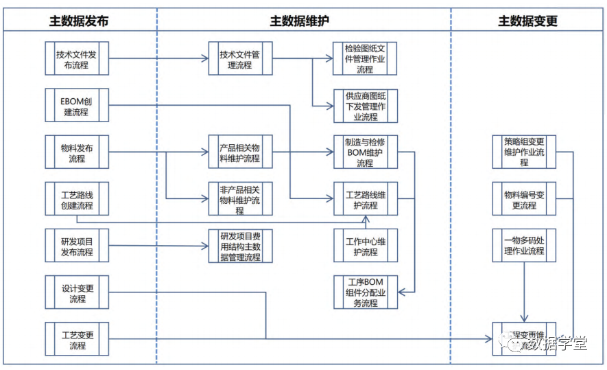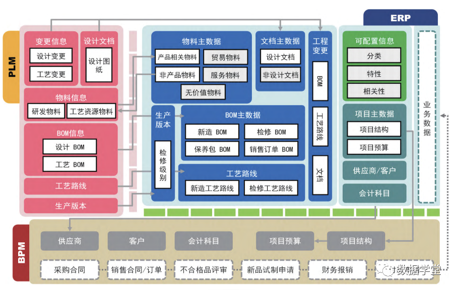 PLM将物料基本视图、BOM和工艺主数据统一同步至ERP的主数据管理平台,其他相关系统在使用主数据时通过数据接口从ERP中订阅主数据,同时主数据平台中数据发生变更时推送至相关订阅者,从而保证不同信息系统中主数据的一致性。