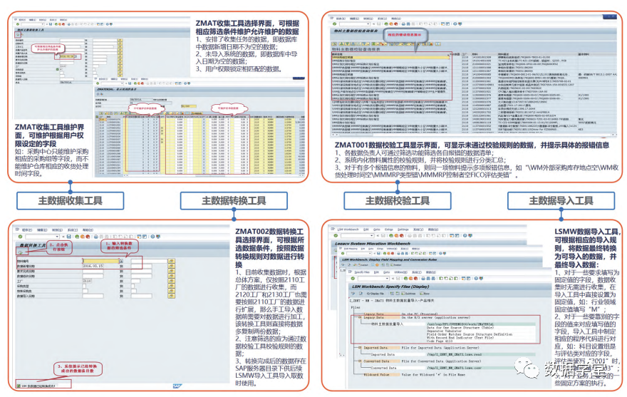 物料主数据收集工具实现了多人并行共同维护同一物料的不同业务属性,减少了数据传递再汇总的过程,数据收集任务由数据组统一安排,统一监控收集进度。物料主数据校验工具可根据业务方案制定各模块的校验规则,形成校验程序。出具未通过校验规则的数据报表,各业务部门的数据负责人可在校验工具的帮助下提前发现问题,避免无效数据进入系统,降低数据收集工作的返工率。物料主数据转换工具可根据业务方案,制定数据转换规则,形成转换程序,批量按照数据管理要求和导入格式,进行整体转换,避免人工失误,提升工作效率。物料主数据导入工具可根据业务需求方案制定导入规则,自动带入方案相关的绑定参数,形成批量导入程序。05 系统实现与应用