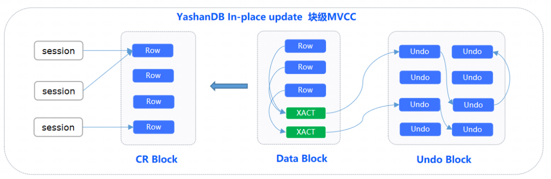 YashanDB针对主流MVCC机制存在的问题,在设计上采用了In-place Update的块级MVCC。块级MVCC与行级MVCC最大的差别是,与历史版本(undo数据)关联的是事务而不是行,当需要查询行的历史版本(一致性版本)时,不再按行构建,而是通过数据块上的事务信息,构建整个数据块级别的历史版本,通常称之为一致性数据块(Consistent Read Block)。
