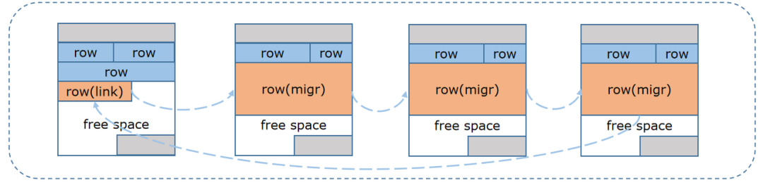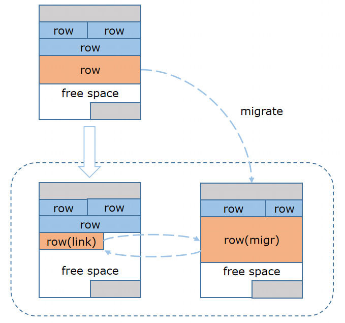 YashanDB的单行最大长度远大于单个数据块的大小,因此需要将单行存储在不同的数据块上。同时在update操作时,原始的行有可能会变长,导致当前数据块没有足够的存储空间,需要分配分配新的空间。YashanDB针对宽行设计了行链接、行迁移机制: