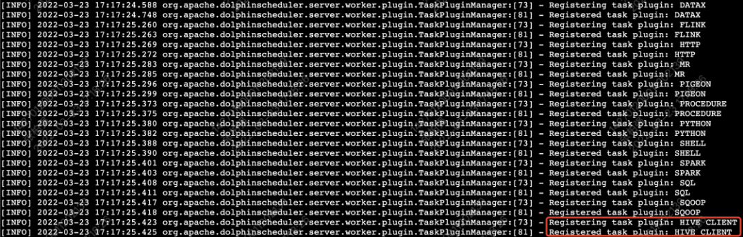 # 1,Resource下创建META-INF/services文件夹,创建接口全类名相同的文件zhang@xiaozhang resources % tree ././└── META-INF└── services└── org.apache.dolphinscheduler.spi.task.TaskChannelFactory# 2,在文件中写入实现类的全限定类名zhang@xiaozhang resources % more META-INF/services/org.apache.dolphinscheduler.spi.task.TaskChannelFactoryorg.apache.dolphinscheduler.plugin.task.hive.HiveClientTaskChannelFactory