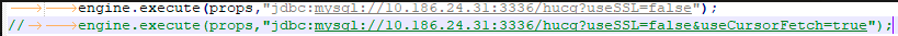 import java.sql.Connection;import java.sql.DriverManager;import java.sql.PreparedStatement;import java.sql.ResultSet;import java.sql.SQLException;import java.sql.Statement;import java.util.Properties;import java.util.concurrent.CountDownLatch;import java.util.concurrent.atomic.AtomicLong;public class SimpleExample {public static void main(String[] args) throws Exception {Class.forName("com.mysql.jdbc.Driver");Properties props = new Properties();props.setProperty("user", "root");props.setProperty("password", "root");SimpleExample engine = new SimpleExample();// engine.execute(props,"jdbc:mysql://10.186.24.31:3336/hucq?useSSL=false");engine.execute(props,"jdbc:mysql://10.186.24.31:3336/hucq?useSSL=false&useCursorFetch=true");}final AtomicLong tmAl = new AtomicLong();final String tableName="test";public void execute(Properties props,String url) {CountDownLatch cdl = new CountDownLatch(1);long start = System.currentTimeMillis();for (int i = 0; i < 1; i++) {TestThread insertThread = new TestThread(props,cdl, url);Thread t = new Thread(insertThread);t.start();System.out.println("Test start");}try {cdl.await();long end = System.currentTimeMillis();System.out.println("Test end,total cost:" + (end-start) + "ms");} catch (Exception e) {}}class TestThread implements Runnable {Properties props;private CountDownLatch countDownLatch;String url;public TestThread(Properties props,CountDownLatch cdl,String url) {this.props = props;this.countDownLatch = cdl;this.url = url;}public void run() {Connection connection = null;PreparedStatement ps = null;Statement st = null;long start = System.currentTimeMillis();try {connection = DriverManager.getConnection(url,props);connection.setAutoCommit(false);st = connection.createStatement();//st.setFetchSize(500);st.setFetchSize(Integer.MIN_VALUE); //仅修改此处即可ResultSet rstmp;st.executeQuery("select sum(k) from sbtest1 group by k");rstmp = st.getResultSet();while(rstmp.next()){}} catch (Exception e) {System.out.println(System.currentTimeMillis() - start);System.out.println(new java.util.Date().toString());e.printStackTrace();} finally {if (ps != null)try {ps.close();} catch (SQLException e1) {e1.printStackTrace();}if (connection != null)try {connection.close();} catch (SQLException e1) {e1.printStackTrace();}this.countDownLatch.countDown();}}}}