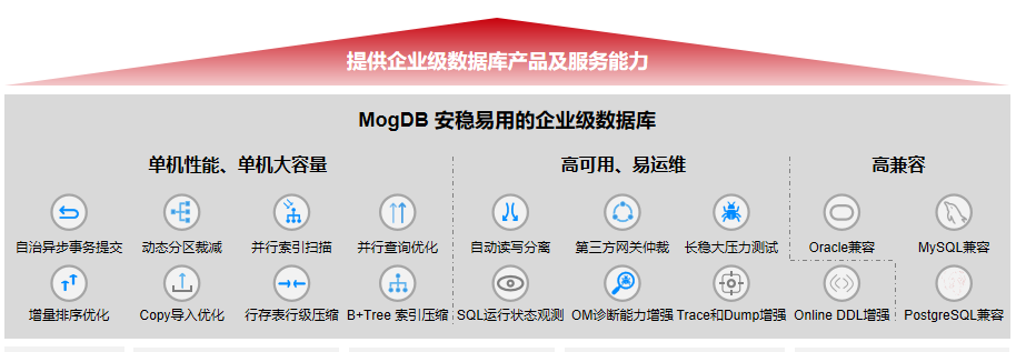 云和恩墨结合自身十余年的技术沉淀和实践积累,投入一流内核研发团队,将商业数据库的能力带入 openGauss 社区,打造 MogDB 核心竞争力,实现高安全、高性能、高兼容、多场景支持等特性,同时在压缩技术、并行、自治、可观测性、一体机等方向重点创新,使其具备金融级高可用和全密态计算的极致安全、面向多核处理器的极致性能、AI自诊断调优的极致智能能力,能够满足从核心交易到复杂计算的企业级业务需求。