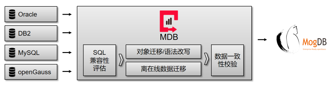 同时,为实现异构数据库快速平滑迁移,MogDB 配套的迁移工具MDB,集成了SQL兼容性评估、对象迁移与语法改写、离在线数据迁移、数据一致性校验等能力,覆盖迁移全过程,有效提升迁移成功率并降低迁移成本。